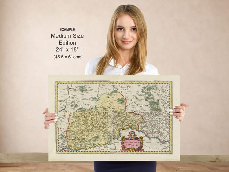 This elegant map shows the German region of Bavaria as it was in the middle of the 17th century. The detail is astounding with hundreds of towns and villages depicted across the entirety of the drawing. The subtle use of colour really lifts the map off the paper drawing the viewer in for closer inspection. An ideal birthday gift for anyone with Germanic decent or connection. Click below to see how the entirety of the map is enhanced when framed.