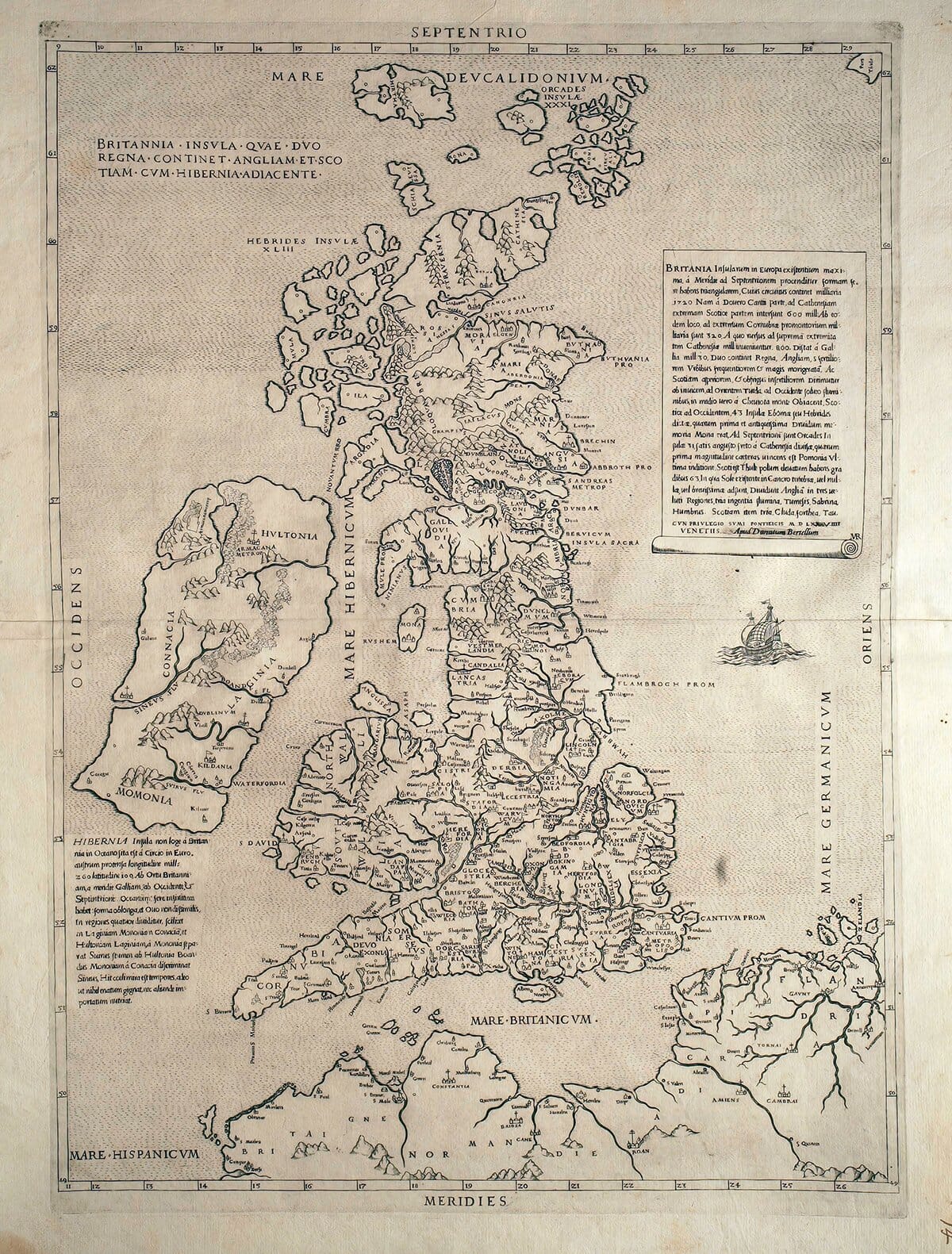 To the north are the Orkney Islands, numbering 31. These abound in barley, fish, and rabbits. The most important of them is Pomona, which is the largest, has a bishop’s seat, and a royal castle.