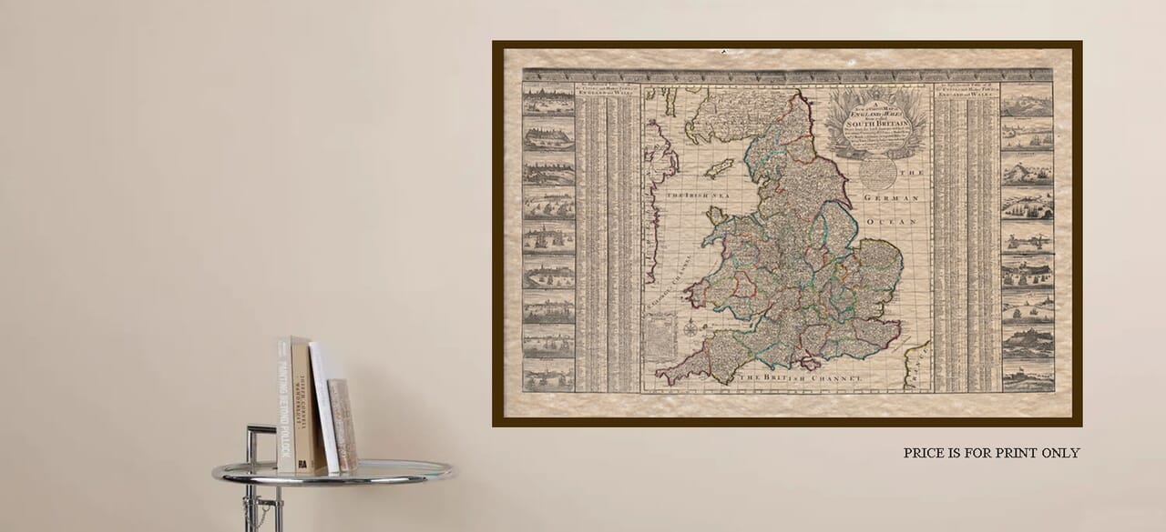 George Willdey is known as a prominent British mapmaker and publisher and produced this quite extraordinary map entitled “A New & Correct Map of England & Wales, Now Called South Britain” in 1717. This map holds a worthy notoriety in the history of Britain’s history of old maps, both for its content and for the historical context in which it was created. The intricate detail provides a valuable insight into 18th century history and the changing political and cultural landscape of the period.