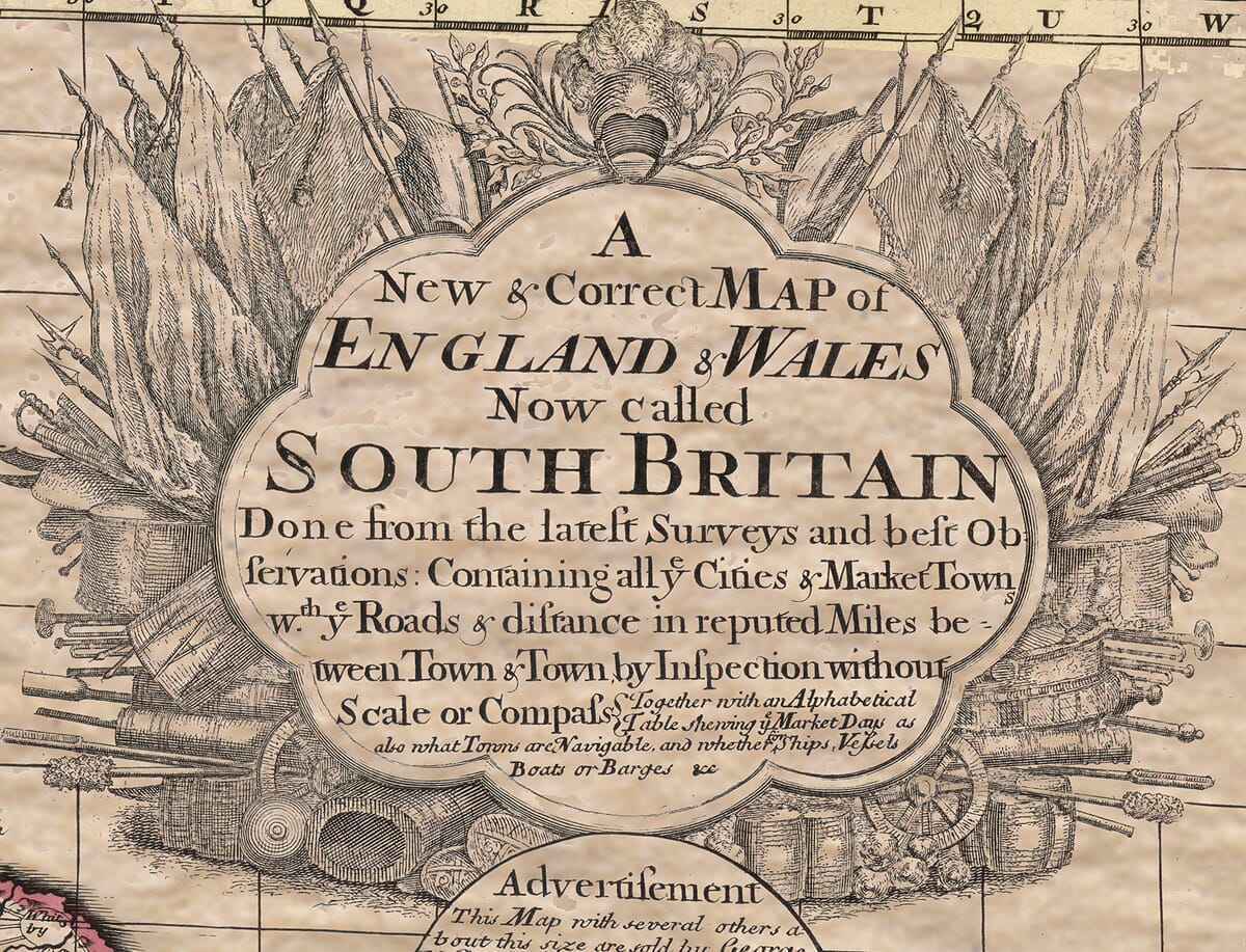 George Willdey’s A New & Correct Map of England & Wales, Now Called South Britain is an intricately detailed map of the island, capturing the landscape of England and Wales with unsurpassed detail and accuracy. As was customary for maps of this period, the map includes a wealth of topographical details, from coastlines to major roads, towns, and cities. What elevates this Old Britain Map and sets it apart is its lavish refinement and attention to detail, which are typical of Willdey’s work. One of the key features of the map is the use of elaborate cartouches (ornate frames that were often employed by 17th and 18th-century mapmakers). These cartouches typically contained information about the map’s origin and publisher, and in Willdey’s map, they provide many additional insights into the political climate of the time.