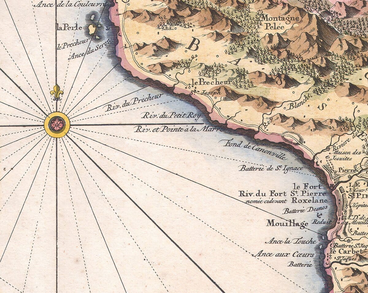 This map draws heavily from the influential work of renowned French cartographers Guillaume De L’Isle (1675–1726) and Philippe Buache (1700–1773), both pivotal figures in the development of scientific cartography. De L’Isle was known for his commitment to accuracy, and Buache, his successor and son-in-law, furthered his legacy through innovative geographical models.
