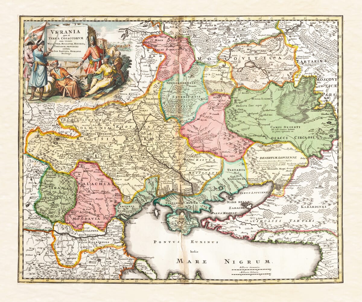 The map titled “Ukrania, Terra Cosaccorum, cum vicinis Walachiae, Moldaviae, Minorisque Tartariae provinciis”—translated as “Ukraine, Land of the Cossacks, with the neighboring provinces of Wallachia, Moldavia, and Little Tartary”—offers a fascinating glimpse into the political and cultural geography of Eastern Europe in the early 18th century.