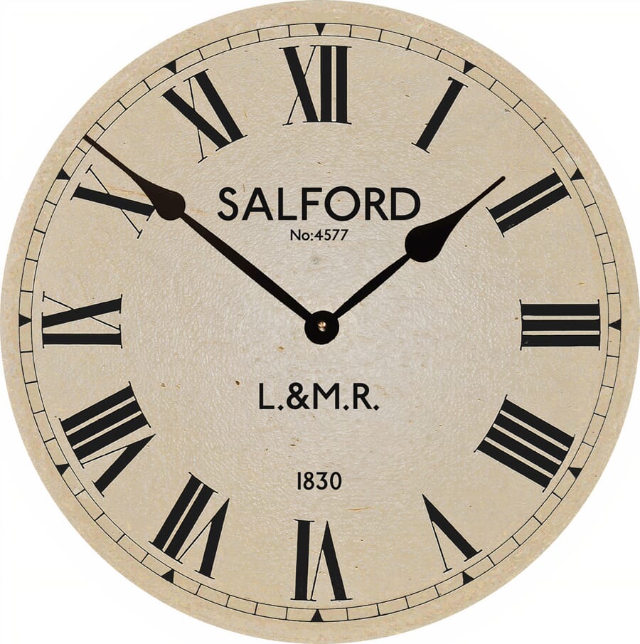 Opening of the Liverpool and Manchester Railway (1830):One of the first major railway lines to serve Salford was the Liverpool and Manchester Railway (L&MR), which opened in 1830 the company name and date we feature on our railway clock reproduction. This railway was the first fully operational intercity line in the world, connecting Liverpool and Manchester, passing through Salford.