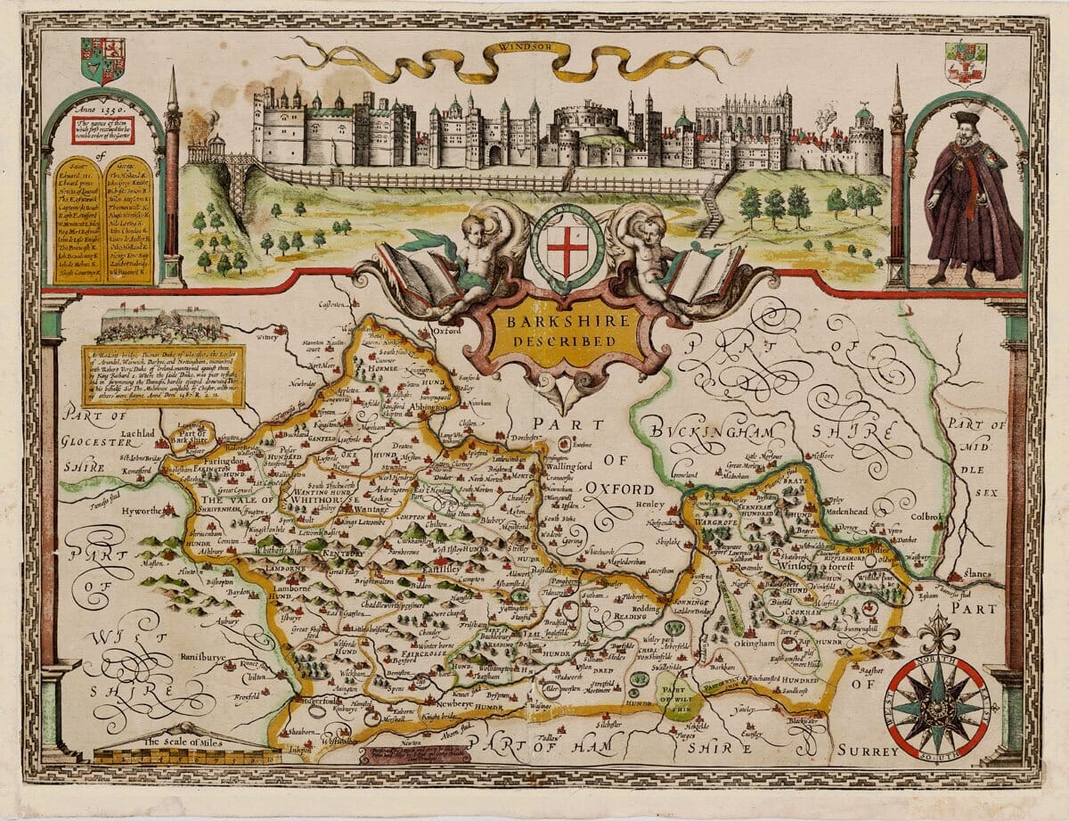 Across the top runs a sweeping panorama of Windsor, with a ribbon naming the town and a detailed prospect of Windsor Castle and its environs. At centre is a richly worked strapwork title cartouche bearing St George’s cross, flanked by cherubs and complemented by coats of arms in the corners. A side panel records the Earls of Berkshire, underlining the map’s antiquarian connection and its interest in functional detail as well as landscape features.