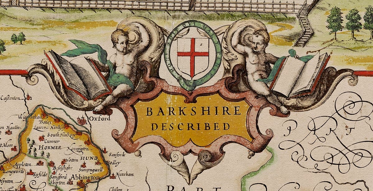 Across the top runs a sweeping panorama of Windsor, with a ribbon naming the town and a detailed prospect of Windsor Castle and its environs. At centre is a richly worked strapwork title cartouche bearing St George’s cross, flanked by cherubs and complemented by coats of arms in the corners. A side panel records the Earls of Berkshire, underlining the map’s antiquarian connection and its interest in functional detail as well as landscape features.