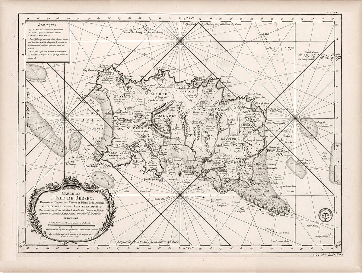 Dating: Bellin’s Jersey chart was issued in the mid-1700s (often catalogued around 1757–1764); the style, Dépôt attribution, and Paris-meridian longitude all line up with that period.