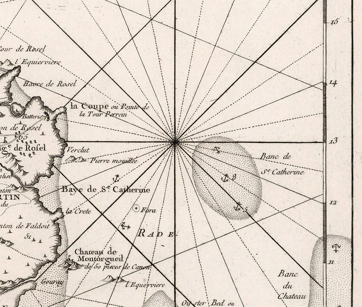 Purpose: It’s a nautical chart, not just a land map. Note the web of rhumb lines from several compass roses, dense soundings (water depths), anchor symbols for good holding ground, and careful shading of shoals and reefs all around Jersey (e.g., the Paternosters to the northwest and hazards off La Corbière and Grouville).