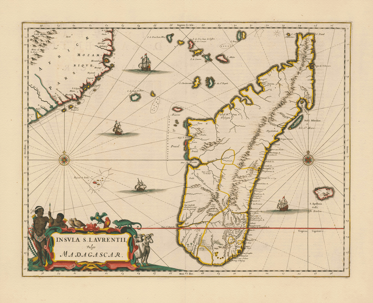 The ships represented upon the sea are not inserted merely for ornament, but to signify the established routes of commerce and discovery. For these waters are seldom empty. They are traversed continually by vessels passing between Europe, Africa, Arabia, and the Indies, carrying goods, men, and intelligence from one quarter of the world to another. The Island of Madagascar, lying as it does along these paths, has long been regarded as a place of great importance, though not yet fully possessed or improved by any European power.